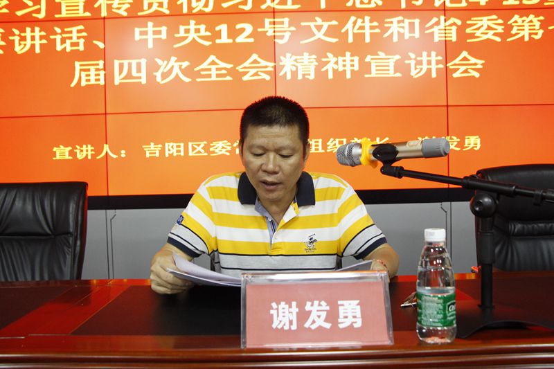 吉陽區(qū)委組織部副部長彭云,區(qū)委組織部有關(guān)負(fù)責(zé)同志,集團(tuán)公司總裁陳云,集團(tuán)公司全體黨員、入黨積極分子30余人聆聽宣講會(huì)。