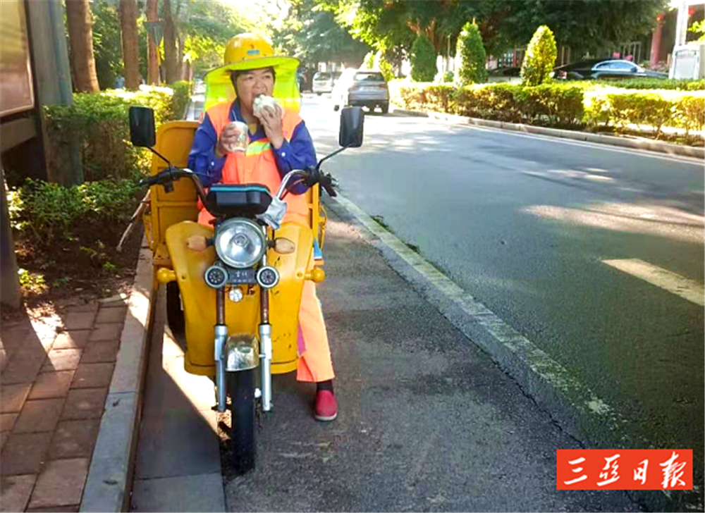 早上常常來不及在家里吃早餐,藍亞燕會帶著微燙的早餐來上班,等清理一段路后,才會吃上一口,而此時早餐往往已經(jīng)涼了。如果累了,要么席地而坐休息幾分鐘,要么在她的“敞篷車”上休息一會。