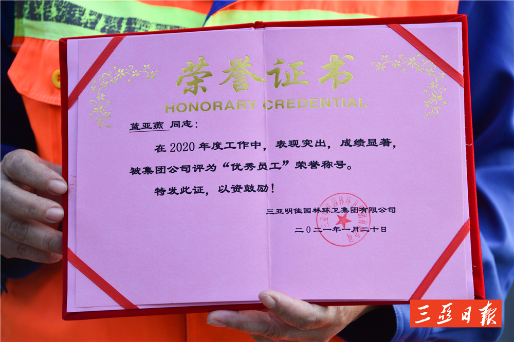 “亞燕是一個工作負責、認真的員工,她工作讓我很放心,平時她還主動幫助其他工人,累活也搶著干。”明佳環(huán)衛(wèi)天涯一隊隊長林海菊這樣評價藍亞燕。