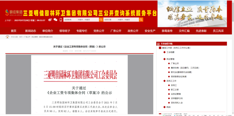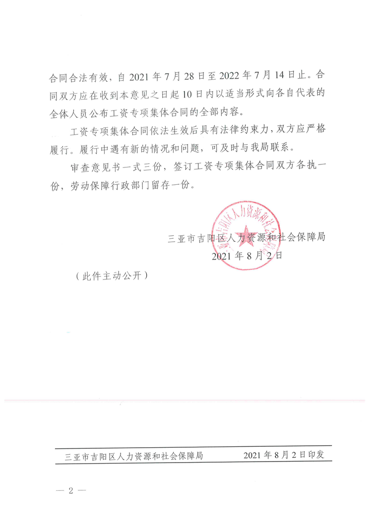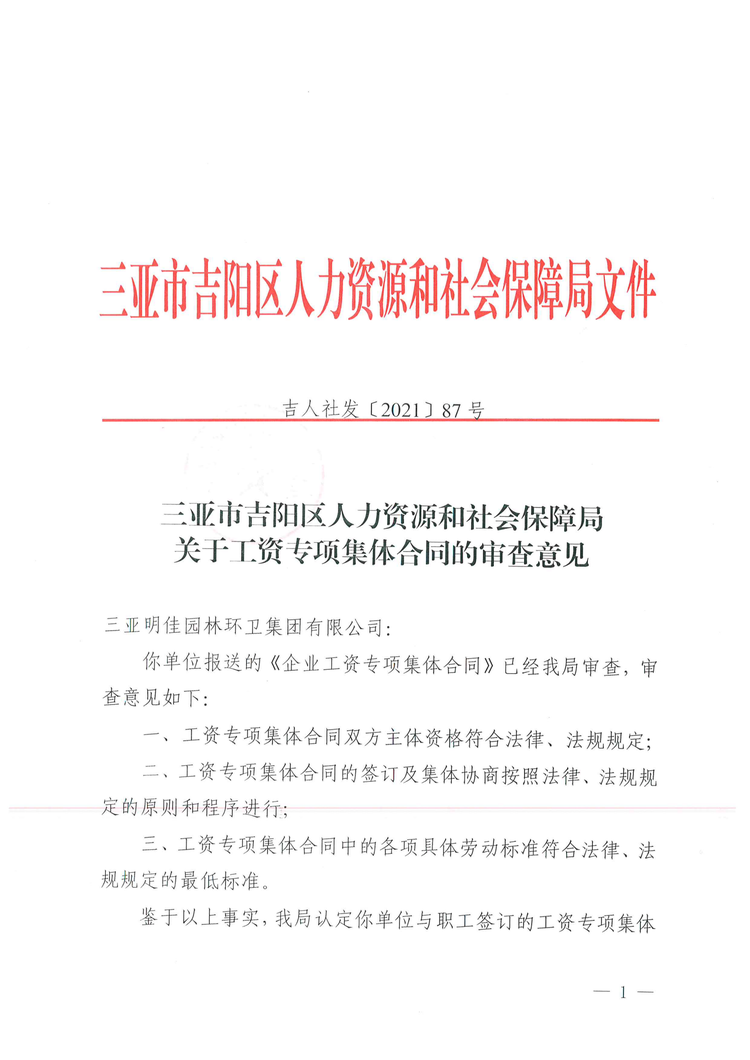 2021年8月2日,吉陽區(qū)人社局審查通過我公司《企業(yè)工資專項(xiàng)集體合同》。8月4日?qǐng)?bào)三亞市總工會(huì)基層工作部備案。至此,三亞明佳園林環(huán)衛(wèi)集團(tuán)有限公司2021年度企業(yè)工資集體協(xié)商工作圓滿結(jié)束。