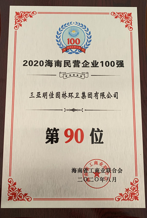 8月28日,“2020海南民營企業(yè)百強(qiáng)發(fā)布會”在海口舉行。三亞明佳園林環(huán)衛(wèi)集團(tuán)有限公司再次入選“海南民營企業(yè)100強(qiáng)”榜單,名列第90位。